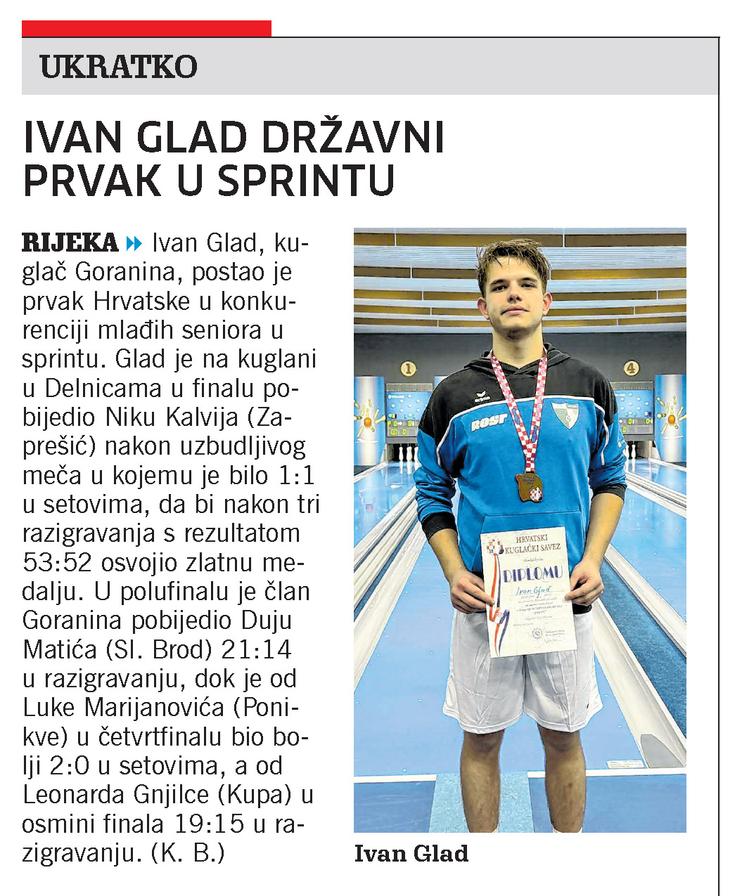 Kuglanje: Ivan Glad državni prvak u sprintu, članak, novi list