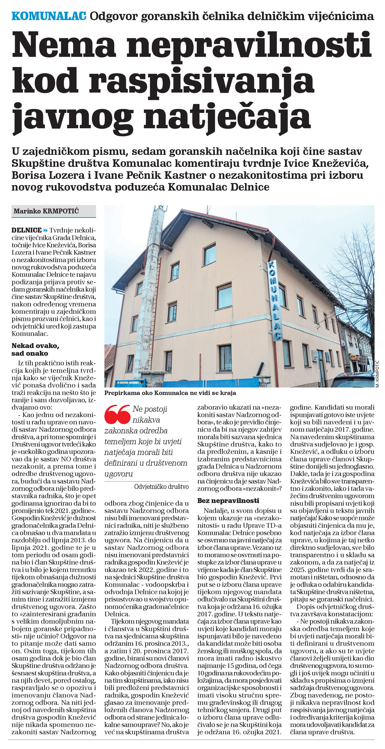Nema nepravilnosti kod raspisivanja javnog natječaja, članak, novi list, komunalac delnice