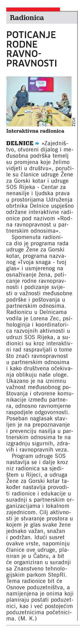 Radionica: Poticanje rodne ravnopravnosti, članak, novi list
